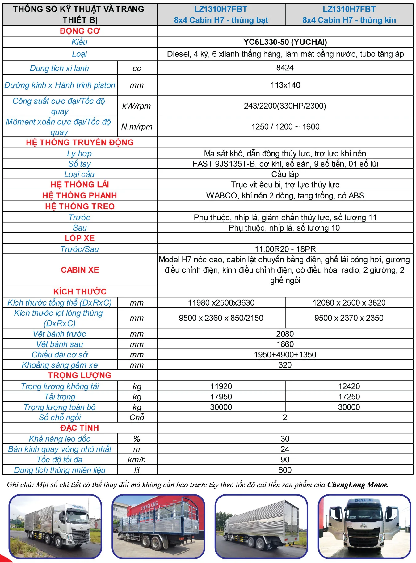 Xe tải thùng kín Chenglong 8x4 330 Hp sử dụng Cabin H7 mới nhất của Chenglong Motor. Đây là dòng cabin thế hệ thứ 5 với điểm mạnh vượt trội về thiết kế cũng như chức năng. Chasiss xe được dập cường độ cao bằng máy dập 6300 tấn duy nhất tại Châu Á, đem đến sự ổn định, chắc chắn, khả năng chịu uốn, xoắn khi chở hàng nặng.