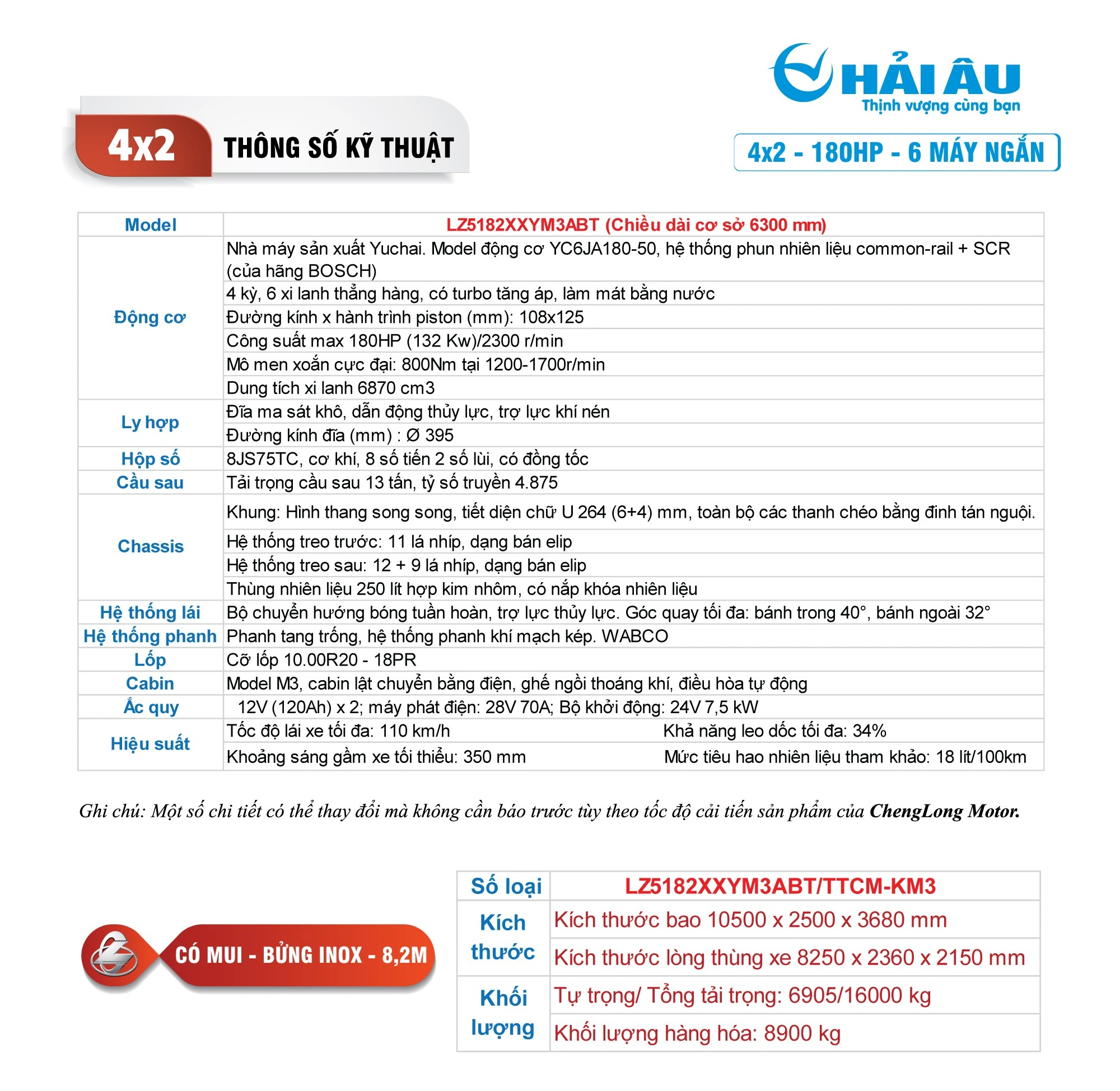 Chenglong M3 4x2 180HP được tích hợp nhiều công nghệ an toàn tiên tiến, bao gồm hệ thống phanh ABS, giúp kiểm soát tốt trong những tình huống phanh gấp và đảm bảo an toàn tối đa cho cả tài xế và hàng hóa. Hệ thống khung gầm chắc chắn giúp xe vận hành ổn định ngay cả khi tải trọng lớn.